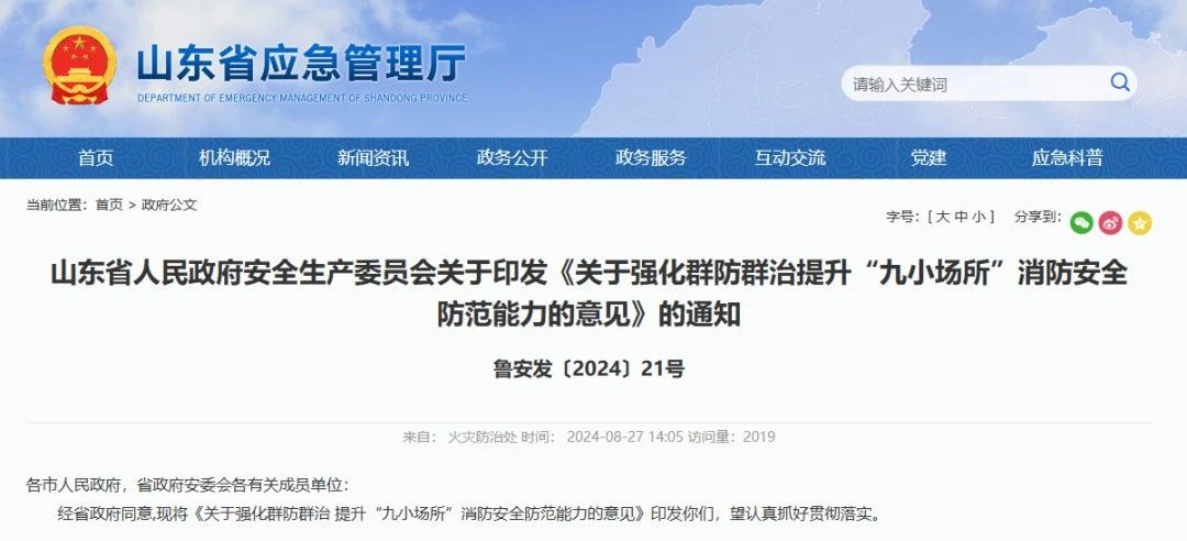 山東省人民政府安全生產(chǎn)委員會關(guān)于印發(fā)《關(guān)于強化群防群治提升“九小場所”消防安全防范能力的意見》的通知 魯安發(fā)〔2024〕21號 各市人民政府,省政府安委...