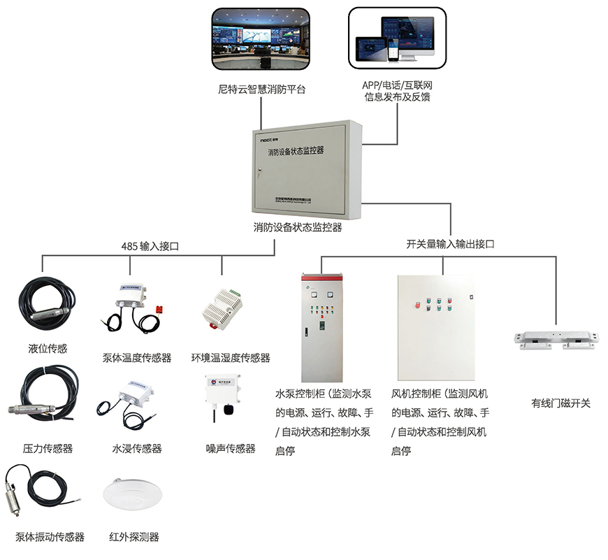 尼特消防設(shè)備狀態(tài)監(jiān)控系統(tǒng)通過(guò)物聯(lián)網(wǎng)網(wǎng)關(guān)和各類傳感器,實(shí)時(shí)監(jiān)測(cè)水泵、風(fēng)機(jī)等消防設(shè)備的電源、運(yùn)行、故障、手自動(dòng)狀態(tài)和控制設(shè)備啟停,同時(shí)還可以監(jiān)測(cè)設(shè)備房?jī)?nèi)的溫濕度、水浸、噪聲、水泵風(fēng)機(jī)振動(dòng)、水泵表面溫度、壓力、液位等信息,讓用戶實(shí)現(xiàn)遠(yuǎn)程設(shè)備監(jiān)測(cè)和控制,有效減少巡檢維護(hù)成本。