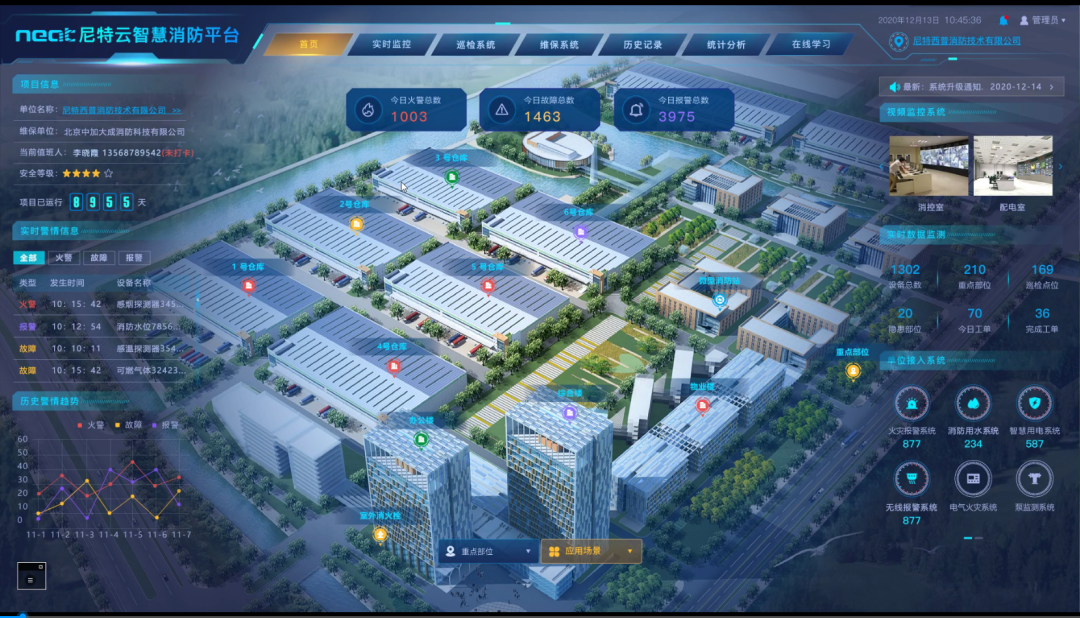 利用用戶信息傳輸裝置實現(xiàn)園區(qū)火災(zāi)自動報警系統(tǒng)的遠程聯(lián)網(wǎng),并將園區(qū)內(nèi)所有消防監(jiān)控信息上傳至尼特云智慧消防平臺,利用多種信息感知手段實現(xiàn)對園區(qū)消防安全狀況的全方位感知、全過程監(jiān)控,全面提升園區(qū)消防安全管理水平。