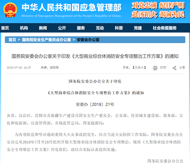 國務(wù)院安委會辦公室于2018年印發(fā)《大型商業(yè)綜合體消防安全專項整治工作方案》,將商業(yè)綜合體的消防工作納入重點工作,要做到有效防治和堅決遏制商業(yè)綜合體重特大火災(zāi)事故發(fā)生,保障人民生命財產(chǎn)安全。