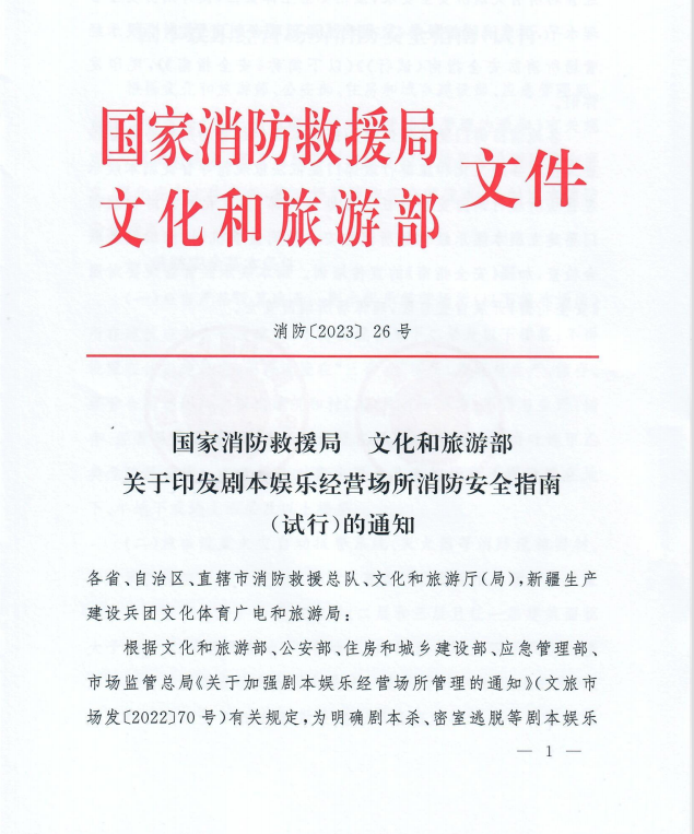 近日,國(guó)家消防救援局、文化和旅游部聯(lián)合印發(fā)《劇本娛樂(lè)經(jīng)營(yíng)場(chǎng)所消防安全指南(試行)》,明確了劇本殺、密室逃脫等劇本娛樂(lè)經(jīng)營(yíng)場(chǎng)所的消防安全基本條件、消防安全管理、用火用電安全管理、易燃易爆可燃物安全管理以及安全疏散管理。