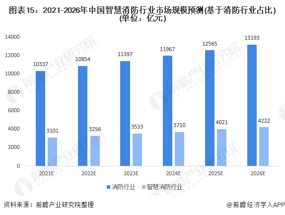 據(jù)前瞻產(chǎn)業(yè)研究院數(shù)據(jù)顯示,預(yù)計(jì)2026年中國消防行業(yè)市場規(guī)模將達(dá)到13193億元,2021~2026年智慧消防行業(yè)滲透率預(yù)計(jì)達(dá)到30%以上。據(jù)此,預(yù)計(jì)到2026年,我國智慧消防系統(tǒng)市場規(guī)模將達(dá)到4222億元。市場潛力巨大,發(fā)展前景廣闊!