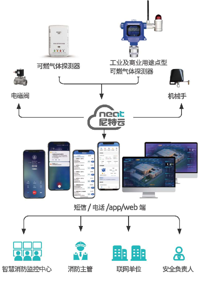 針對家用和工業(yè)及商業(yè)場所,尼特?fù)碛卸喾N可燃氣體探測探測器,可以實時監(jiān)測天然氣、液化石油氣等燃氣濃度,當(dāng)檢測到燃氣濃度超標(biāo)時,通過4G\NB\LoRa等無線通訊技術(shù)把探測信息實時傳回到尼特云智慧消防管理平臺,以電話、短信、平臺預(yù)警、APP 通知等方式將報警信息通知到業(yè)主單位,并聯(lián)動電磁閥自動關(guān)閉燃氣閥門,實現(xiàn)火災(zāi)事故的早發(fā)現(xiàn)、早報警、早處置。