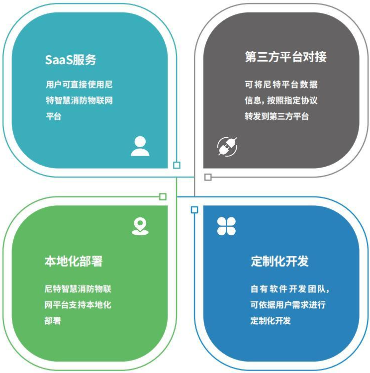 作為國內(nèi)領(lǐng)先的物聯(lián)網(wǎng)消防整體解決方案提供商,尼特智能歷經(jīng)多年的市場探索和經(jīng)驗(yàn)總結(jié),建立了SaaS服務(wù)、第三方平臺(tái)對(duì)接、本地化部署、定制化開發(fā)等多種服務(wù)模式,構(gòu)建了定制化、一站式服務(wù)體系,從應(yīng)用層實(shí)現(xiàn)了城市各類場所與消防安全管理單位的互聯(lián)互通,讓城市消防安全風(fēng)險(xiǎn)綜合監(jiān)測(cè)預(yù)警工作部署更快速、更靈活、更便捷。