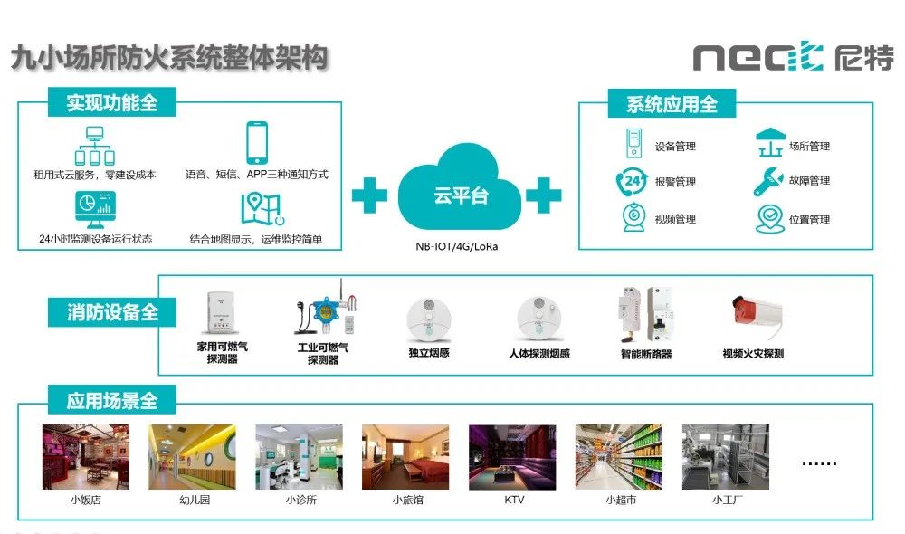 為破解“九小場所”的火災(zāi)預(yù)警和監(jiān)管難題,尼特運(yùn)用物聯(lián)網(wǎng)核心技術(shù),推出九小場所智慧消防解決方案,通過獨(dú)立式感煙火災(zāi)探測器、獨(dú)立可燃?xì)怏w探測器、智能斷路器等前端感知設(shè)備實(shí)時監(jiān)測火警情況,發(fā)生異常情況,第一時間將數(shù)據(jù)實(shí)時傳輸至尼特云智慧消防平臺,并通過語音電話、短信、小尼平安APP推送等多種方式及時通知給用戶可第一時間現(xiàn)場復(fù)核,相關(guān)監(jiān)管部門同步聯(lián)動復(fù)核,進(jìn)一步實(shí)現(xiàn)火情的早發(fā)現(xiàn)、早處理。