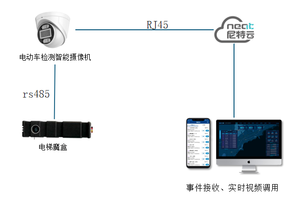 在電梯內安裝電梯相機與電梯魔盒,采集電梯運行方向、故障狀態(tài)、當前樓層、開關門狀態(tài)、樓層號、里程數(shù)、速度等信息,當電瓶車抵達電梯,立即識別,不斷發(fā)出語音警報提示禁止電瓶車上樓,且電梯門也無法關閉,直到電瓶車退出電梯才能恢復正常,同時可以通過原有的硬盤錄像機或尼特云智慧消防管理平臺調取監(jiān)控視頻,方便管理及問題追溯。