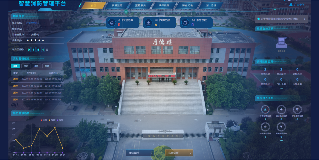 解決方案:針對(duì)學(xué)?;拘畔?、建筑信息、重點(diǎn)部位信息、消防設(shè)施信息、人員信息等消防相關(guān)信息,建立尼特云智慧消防管理平臺(tái),對(duì)各類消防設(shè)施進(jìn)行實(shí)時(shí)監(jiān)測(cè),方便清晰了解校園內(nèi)每個(gè)區(qū)域的消防情況,協(xié)助決策。