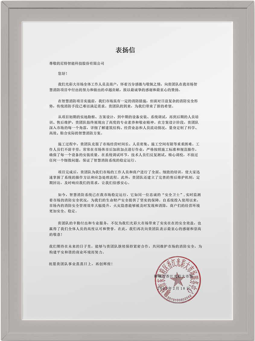 在信的結(jié)尾,市場工作人員及商戶用最樸實卻最真摯的話語表達了對值守中心人員及尼特智能產(chǎn)品的感謝。他們說,智慧消防系統(tǒng)已成為忠誠的“安全衛(wèi)士”,有了它,市場消防安全管理效率大幅提升。未來,我們將繼續(xù)努力,讓智慧消防產(chǎn)品走進更多的場所,守護更多人的生命財產(chǎn)安全,不負(fù)這份信任與期待。