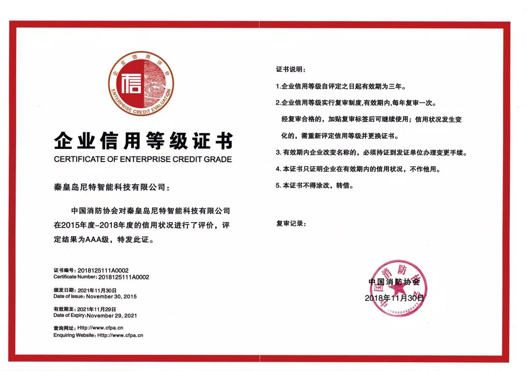 這是我公司在2012年10月以綜合評分第一名獲評中國消防行業(yè)信用等級評價(jià)AAA級企業(yè)以來,復(fù)審后繼續(xù)獲此殊榮。