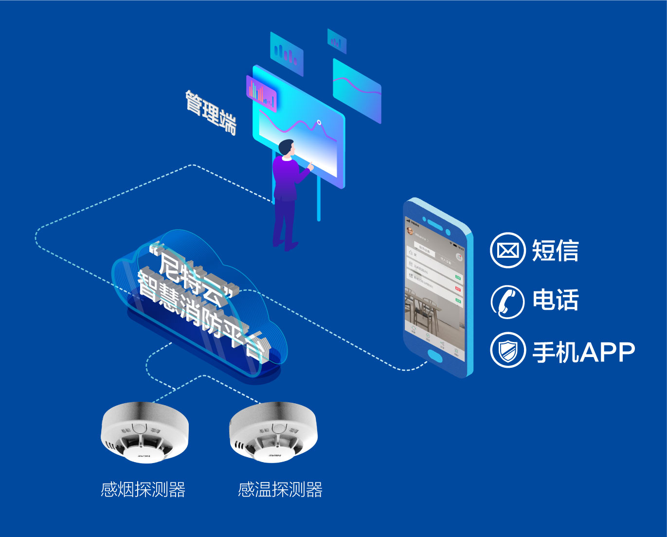 探測(cè)器感知到報(bào)警信息即時(shí)推送至關(guān)聯(lián)手機(jī),并以APP提醒、短信提醒、電話提醒等多種方式告警。當(dāng)火警解除時(shí),也會(huì)將消息下發(fā)至關(guān)聯(lián)手機(jī),減少用戶(hù)擔(dān)憂(yōu)。探測(cè)器可與尼特云平臺(tái)進(jìn)行通訊,實(shí)現(xiàn)全方位監(jiān)控管理,減少火災(zāi)帶來(lái)的損失。