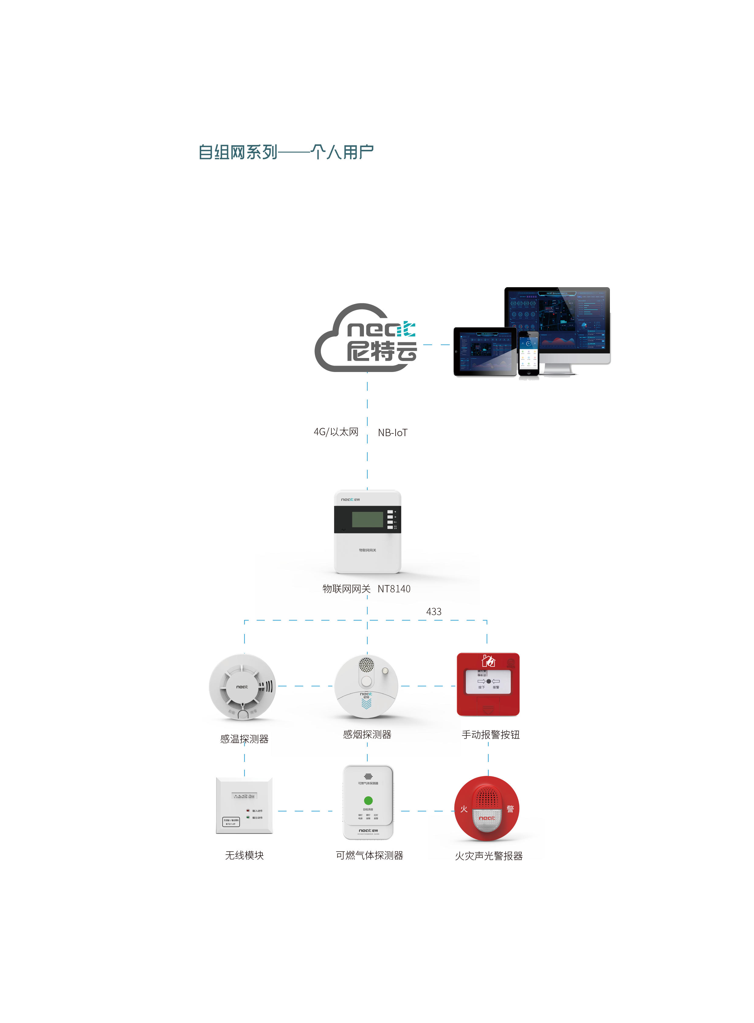尼特?zé)o線火災(zāi)報(bào)警系統(tǒng)自組網(wǎng)系列個(gè)人用戶解決方案由物聯(lián)網(wǎng)網(wǎng)關(guān)、感溫探測(cè)器、感煙探測(cè)器、可燃?xì)怏w探測(cè)器、火災(zāi)聲光警報(bào)器、手動(dòng)火災(zāi)報(bào)警按鈕等設(shè)備組成,并通過(guò)4G/以太網(wǎng)/NB/WiFi等形式進(jìn)行組網(wǎng),應(yīng)用前景廣泛。