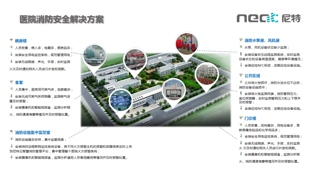 醫(yī)院屬于消防重點(diǎn)防護(hù)單位,人員相對集中,病人多且行動(dòng)不便,醫(yī)院里的儀器、化學(xué)試劑、被褥等易燃易爆品,都易成為醫(yī)院火災(zāi)的“導(dǎo)火索”,因此,保護(hù)醫(yī)院消防安全,尤為重要,尼特智慧消防解決方案從根源協(xié)助醫(yī)院預(yù)防火災(zāi)發(fā)生,保障醫(yī)院消防安全。