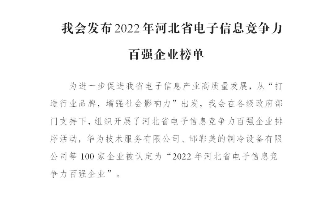 為深入貫徹落實(shí)國(guó)家和省產(chǎn)業(yè)規(guī)劃部署,河北省信息產(chǎn)業(yè)與信息化協(xié)會(huì)從“打造行業(yè)品牌,增強(qiáng)社會(huì)影響力”出發(fā),立足新發(fā)展階段,貫徹新發(fā)展理念,構(gòu)建新發(fā)展格局,發(fā)布了“2022 年河北省電子...